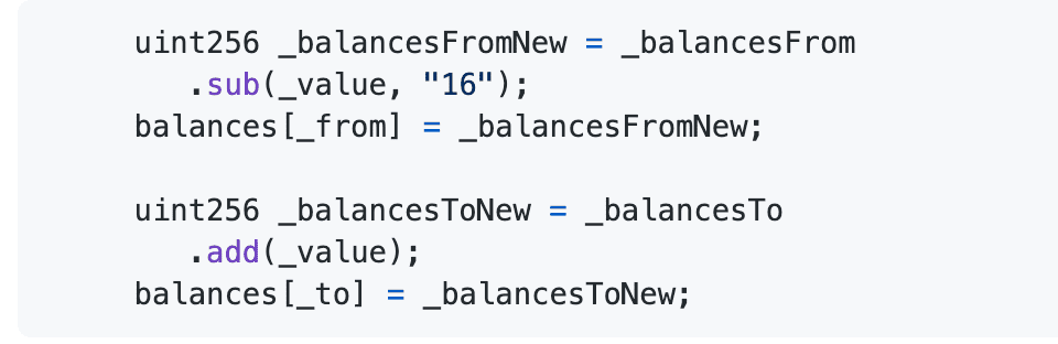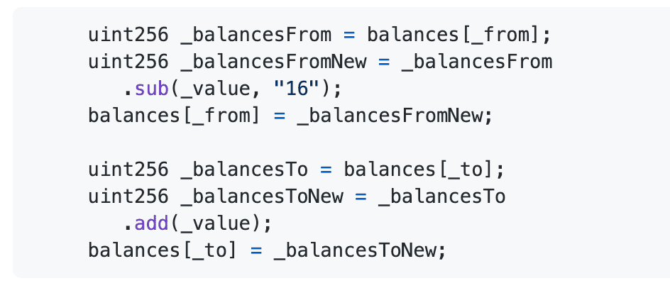 上面的问题导致 _balancesFrom余额的减少,并增加_balancesTo的余额,最后最重要的部分是保存_balancesFromNew和 _balancesToNew。那么攻击者就能够有效地人工增加自己的余额。