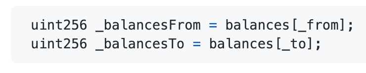 当_from和_to地址相同时,会导致_balancesFrom和_balancesTo相等。