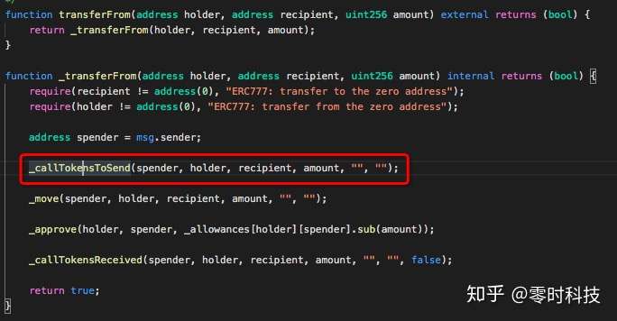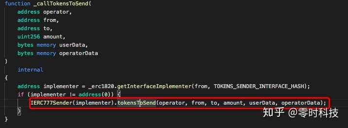 imBTC合约的 transferFrom 函数中,接着调用 _callTokensToSend 函数,跟进: