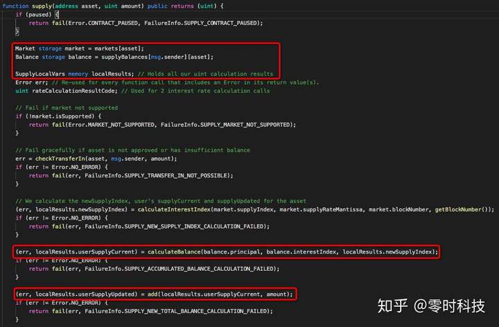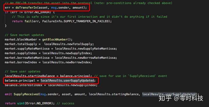 看一下 http://Lendf.Me 合约的supply函数,在supply函数的开头,申请了临时变量localResults,然后将用户的余额保存在 localResults.userSupplyCurrent中,如下图所示: