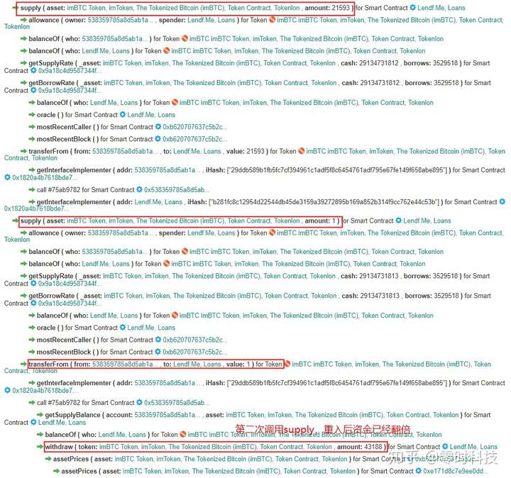 从上图可以看到,最终在交易 https://cn.etherscan.com/tx/0xced7ca813081fb594181469001a6aff629c5874bd672cca44075d3ec768db664 中,基本已达到 imBTC 的最大存量,此时将 http://Lendf.Me 账户中的 imBTC 资产盗取一空。