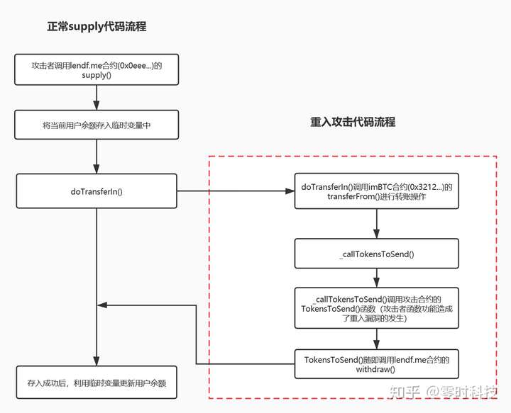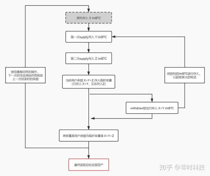 在 withdraw() 函数执行完后,继续回到supply调用了 doTransferIn 函数的后面继续执行,虽然在 withdraw() 函数中,用户取出余额之后,进行了余额数量更新,但是回到supply之后,继续执行后面的内容,那么在supply的最后再次更新了用户的余额,导致覆盖了用户 withdraw 之后余额数量的值。