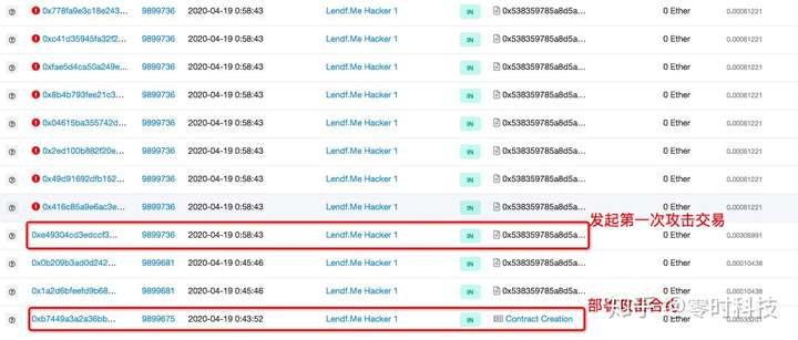 本次针对 http://Lendf.Me 实施攻击的攻击者地址为: 0xa9bf70a420d364e923c74448d9d817d3f2a77822,攻击者的合约地址为: 0x538359785a8d5ab1a741a0ba94f26a800759d91d ,攻击者通过此合约对 http://Lendf.Me 进行攻击。如下图所示: