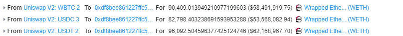 攻击者首先利用Uniswap进行闪电贷借款,并采用镶嵌式(还款前连续操作)的手法,在WBTC2、USDC3以及USDT2池中分别进行了WETH借贷,如下图所示: